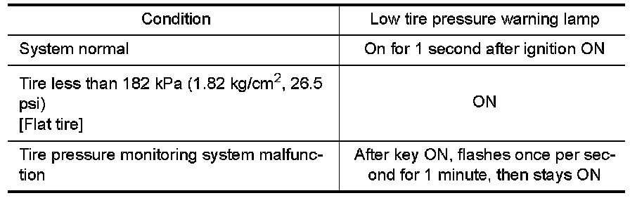 The combination meter receives tire pressure status from the BCM using CAN communication. When a low tire pressure condition is sensed by the BCM, the combination meter low tire pressure warning lamp is activated.