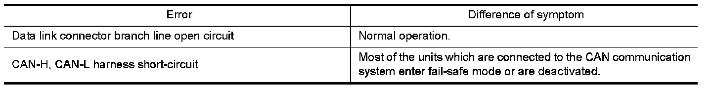 - When data link connector branch line is open, transmission and reception of CAN communication signals are not affected. Therefore, no symptoms occur. However, be sure to repair malfunctioning circuit.