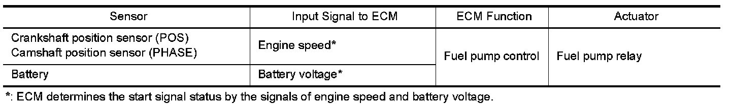 The ECM activates the fuel pump for several seconds after the ignition switch is turned ON to improve engine start ability. If the ECM receives a engine speed signal from the crankshaft position sensor (POS) and camshaft position sensor (PHASE), it knows that the engine is rotating, and causes the pump to operate. If the engine speed signal is not received when the ignition switch is ON, the engine stalls. The ECM stops pump operation and prevents battery discharging, thereby improving safety. The ECM does not directly drive the fuel pump. It controls the ON/OFF fuel pump relay, which in turn controls the fuel pump.