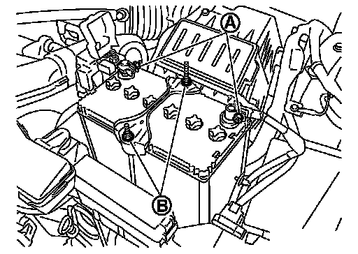1. Loosen battery terminal nuts (A), and disconnect both negative and positive battery terminals.