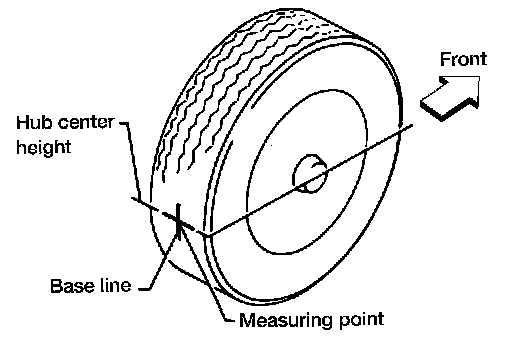 3. Put a mark on base line of the tread (rear side) of both tires at the same height of hub center. These are measuring points.