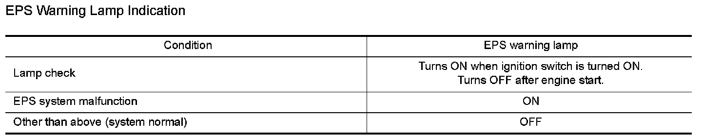 Turns ON when there is a malfunction in EPS system. It indicates that fail-safe mode is engaged and enters a manual steering state (Control turning force steering wheel becomes heavy).