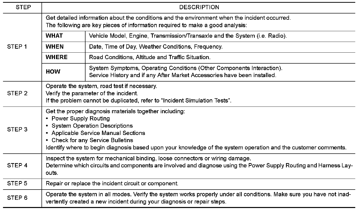 Sometimes the symptom is not present when the vehicle is brought in for service. If possible, re-create the conditions present at the time of the incident. Doing so may help avoid a No Trouble Found Diagnosis. The following section illustrates ways to simulate the conditions/environment under which the owner experiences an electrical incident.