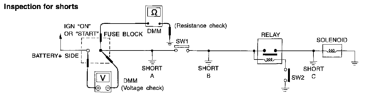 voltage; short is down the circuit of the relay or between the relay and the disconnected solenoid (point C).
