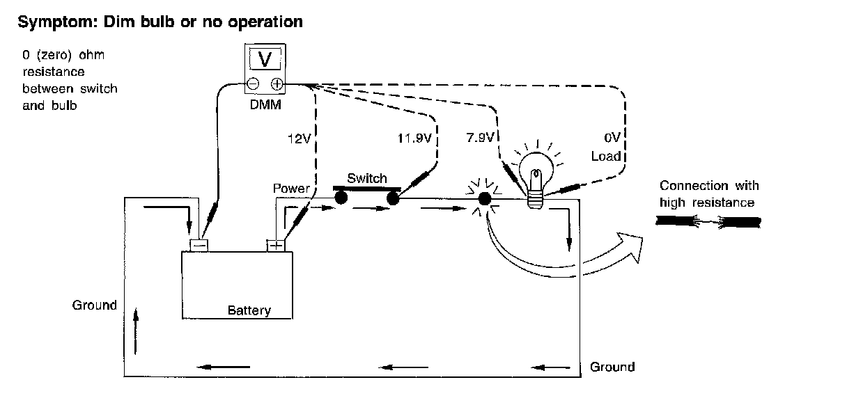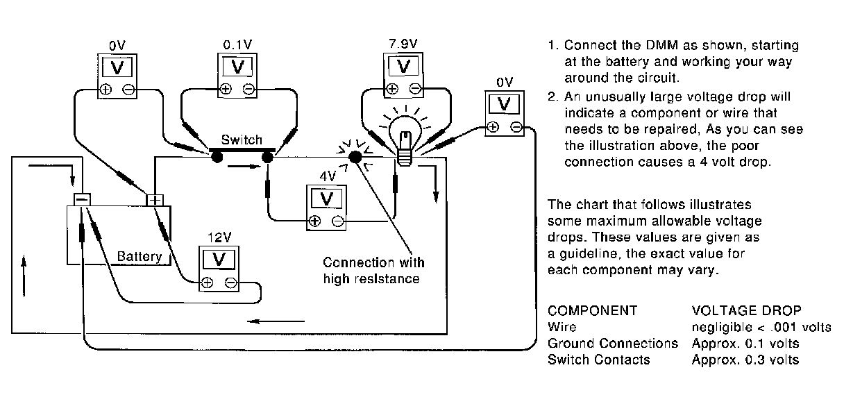 Note in the illustration that there is an excessive 4.1 volt drop between the battery and the bulb.