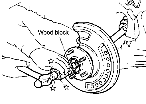5. Separate the drive shaft from the wheel hub and bearing assembly by lightly tapping the end of the drive shaft using a hammer or suitable tool and wood block, and then remove hub lock nut.