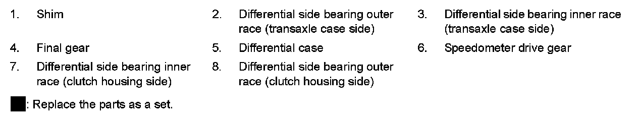 Replace differential side bearing outer race (transaxle case side) and differential side bearing inner race (transaxle case side) as a set.