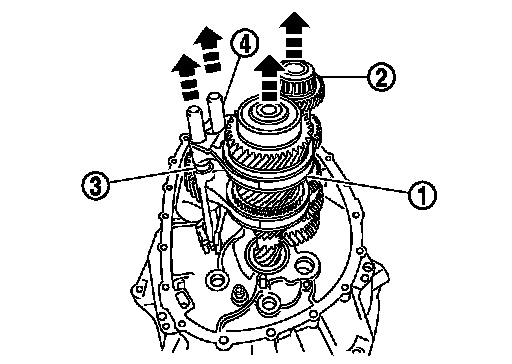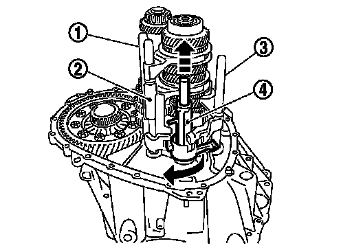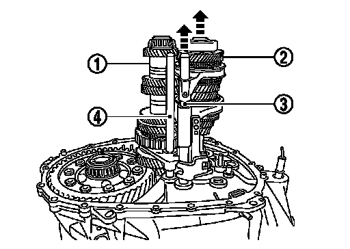 13. Pull up and remove input shaft assembly (1), mainshaft assembly (2), fork rod (3), and 1st-2nd fork rod (4) from clutch housing.