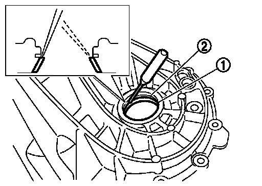 27. Remove snap ring (1) and oil channel (2) from transaxle case.