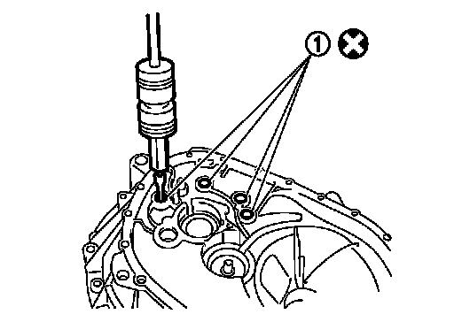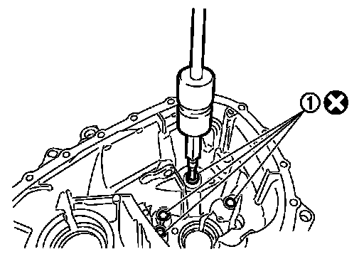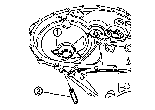 17. Remove differential side bearing outer race (1) from clutch housing, using a brass rod.
