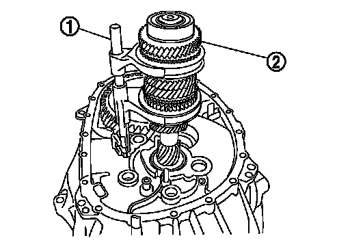 23. Set fork rod (1) to input shaft assembly (2), and then install them to clutch housing.