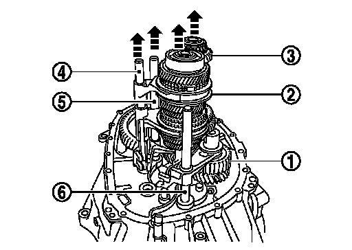 b. Pull up input shaft assembly (2), mainshaft assembly (3), fork rod (4), and 1st-2nd fork rod (5).