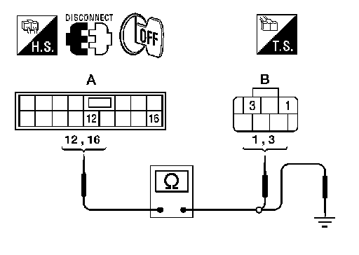 3. Check continuity between main power window and door lock/unlock switch connector D5 (A) terminals 6, 7 and front power window motor LH connector D8 (B) terminals 1, 3.