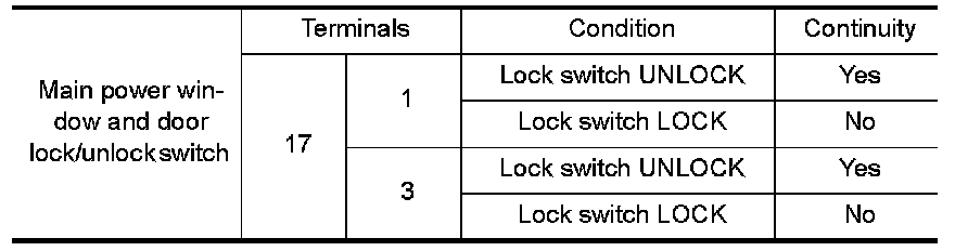 Check continuity between main power window and door lock/unlock switch terminals.