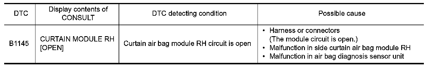 1.Replace curtain air bag module RH. Refer to "Removal and Installation" Removal And Installation.