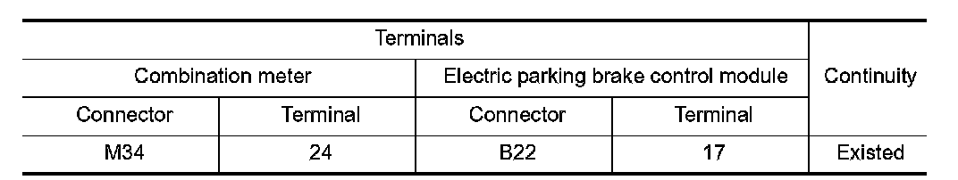 3.Check continuity between combination meter harness connector and electric parking brake control module harness connector.