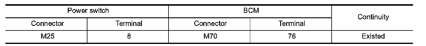 2.Check continuity between power switch harness connector and BCM harness connector.