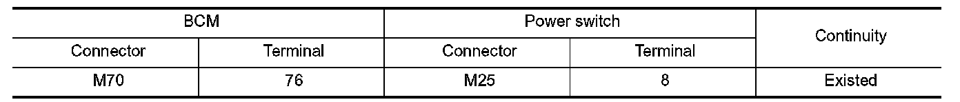 2.Check continuity between BCM harness connector and power switch harness connector.