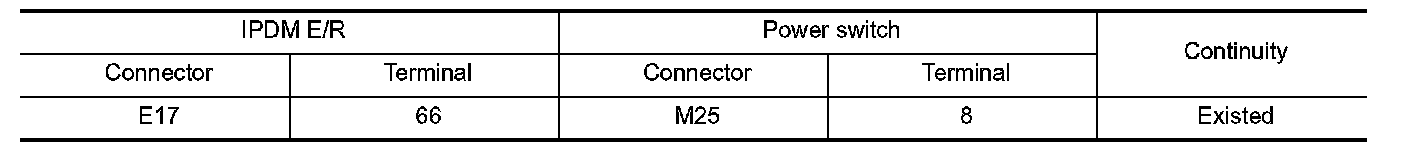2.Check continuity between IPDM E/R harness connector and power switch harness connector.