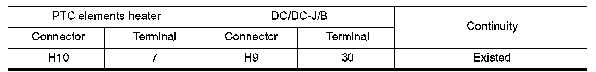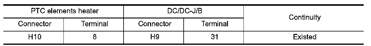 Check continuity between PTC elements heater high voltage harness connector and DC/DC-J/B high voltage harness connector.