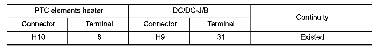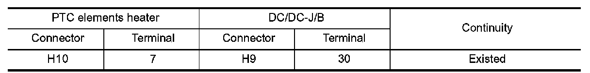 Check continuity between PTC elements heater high voltage harness connector and DC/DC-J/B high voltage harness connector.