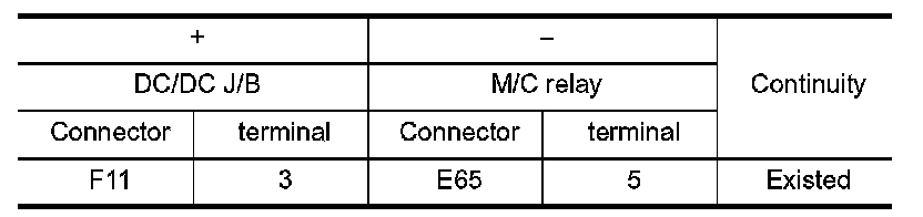 1.Check the continuity between DC/DC junction box harness connector and M/C relay harness connector.