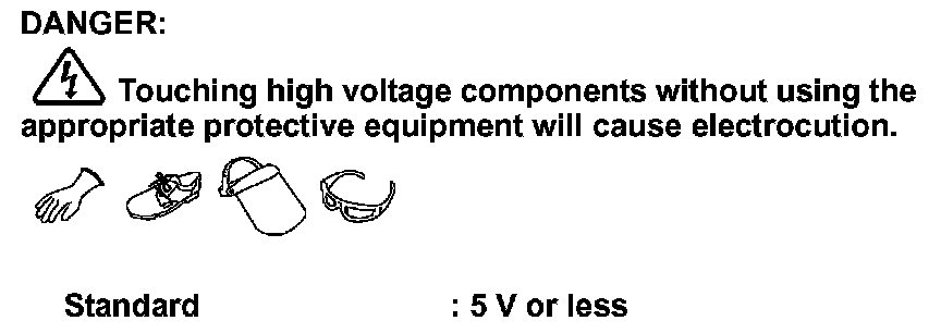 - Be sure to wear insulating protective equipment consisting of glove, shoes, face shield and glasses before beginning work on the high voltage system.