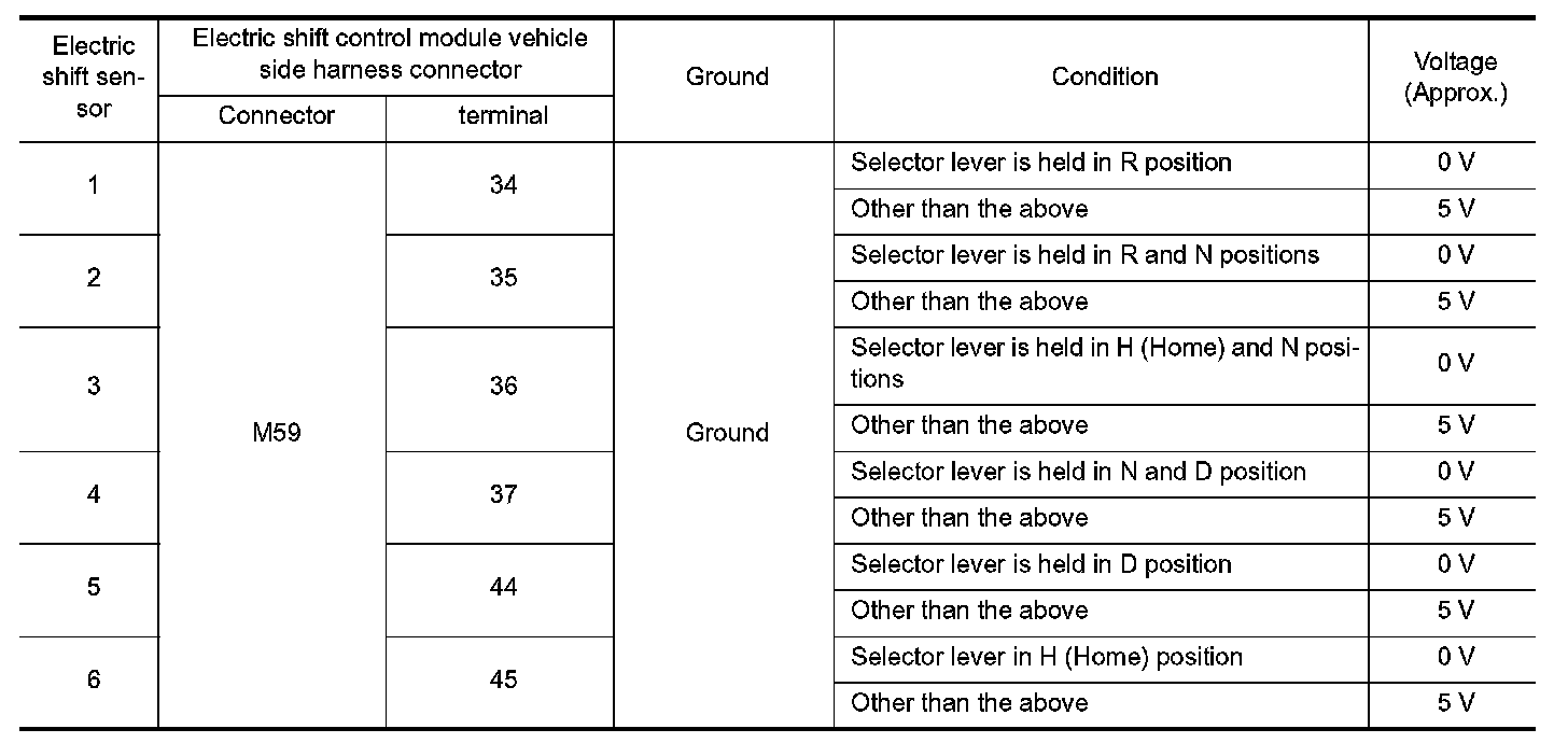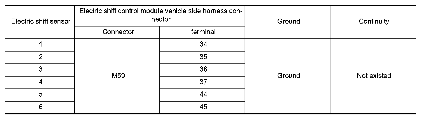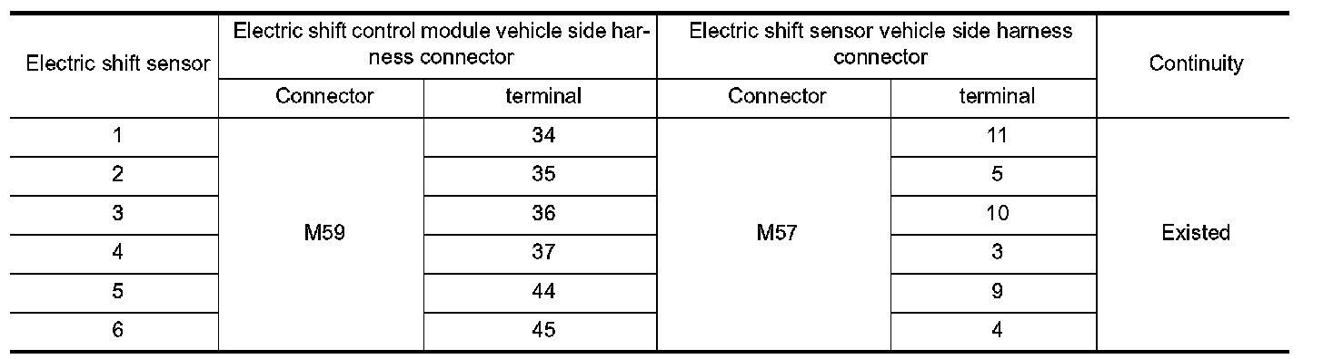 4.Check the continuity between the malfunctioning electric shift sensor identified at Step 1 and the harness connector terminal located on the vehicle side of the electric shift control module.