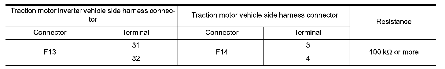 2.Check the resistance between traction motor inverter vehicle side harness connector terminals and traction motor vehicle side harness connector terminals.