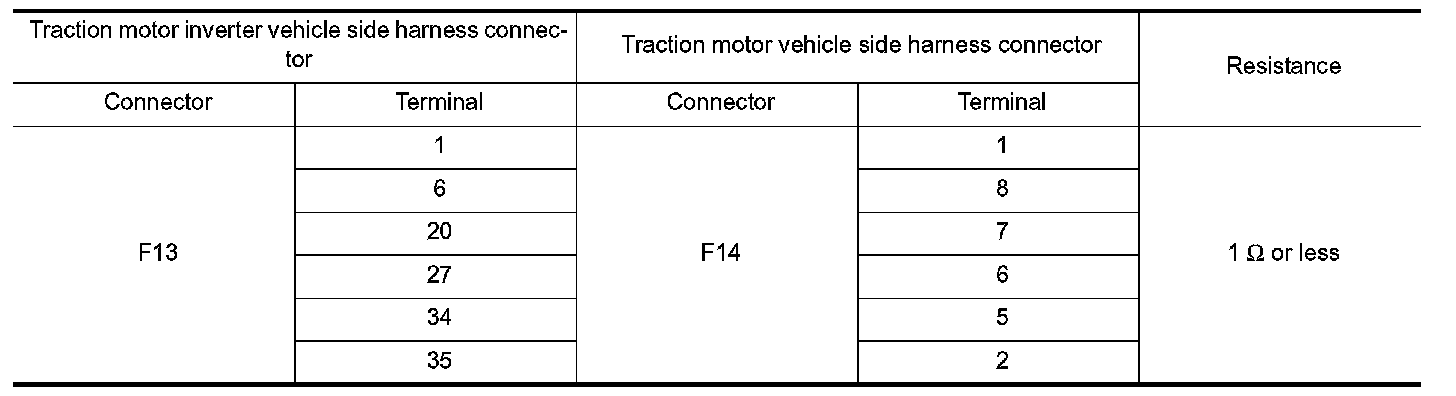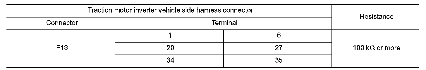2.Check the resistance between traction motor inverter vehicle side harness connector terminals and traction motor vehicle side harness connector terminals.