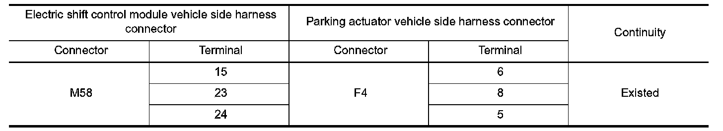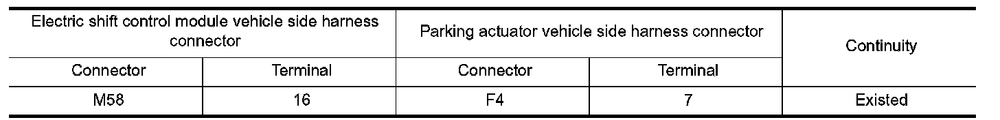 3.Check the continuity between electric shift control module vehicle side harness connector terminal and parking actuator vehicle side harness connector terminal.