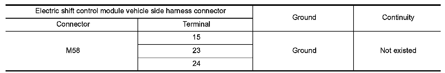 4.Check the continuity between electric shift control module vehicle side harness connector terminals and ground.