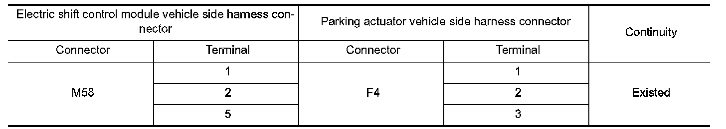 5.Check the continuity electric shift control module vehicle side harness connector terminals and parking actuator vehicle side harness connector terminals.