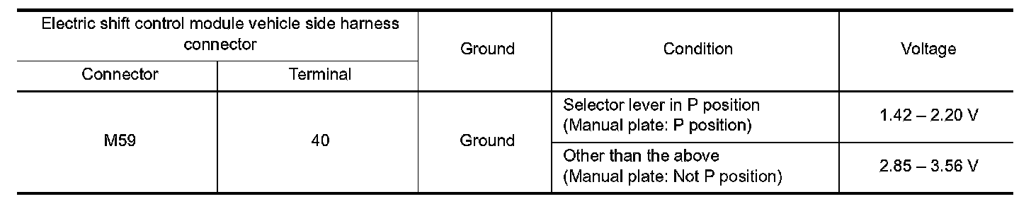 1.Check the voltage between electric shift control module vehicle side harness connector terminal and ground.