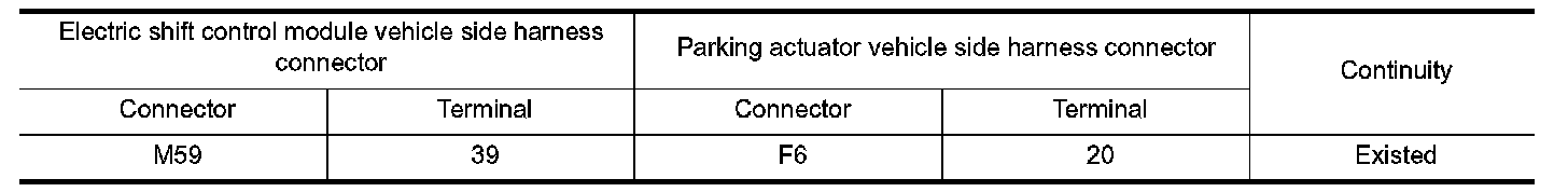 3.Check the continuity between electric shift control module vehicle side harness connector terminal and parking actuator vehicle side harness connector terminal.