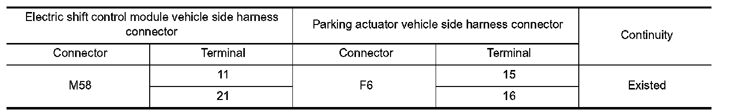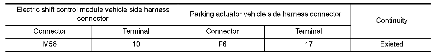 3.Check the continuity between electric shift control module vehicle side harness connector terminal and parking actuator vehicle side harness connector terminal.