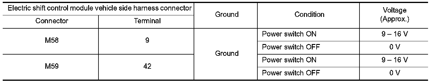 - Harness for short or open between power switch and electric shift control module vehicle side harness connector terminal 42.