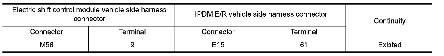 2.Check the continuity between IPDM E/R vehicle side harness connector terminal and electric shift control module vehicle side harness connector terminal.