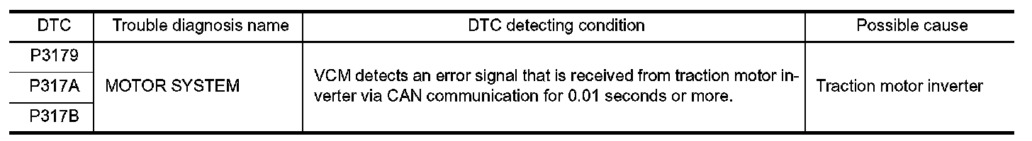 This DTC is detected when the traction motor inverter detects DTC. If this DTC detected, perform trouble diagnosis for a DTC that detected by traction motor inverter.