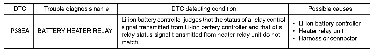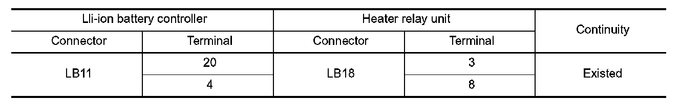 Check continuity heater relay unit harness connector and li-ion battery controller harness connector.