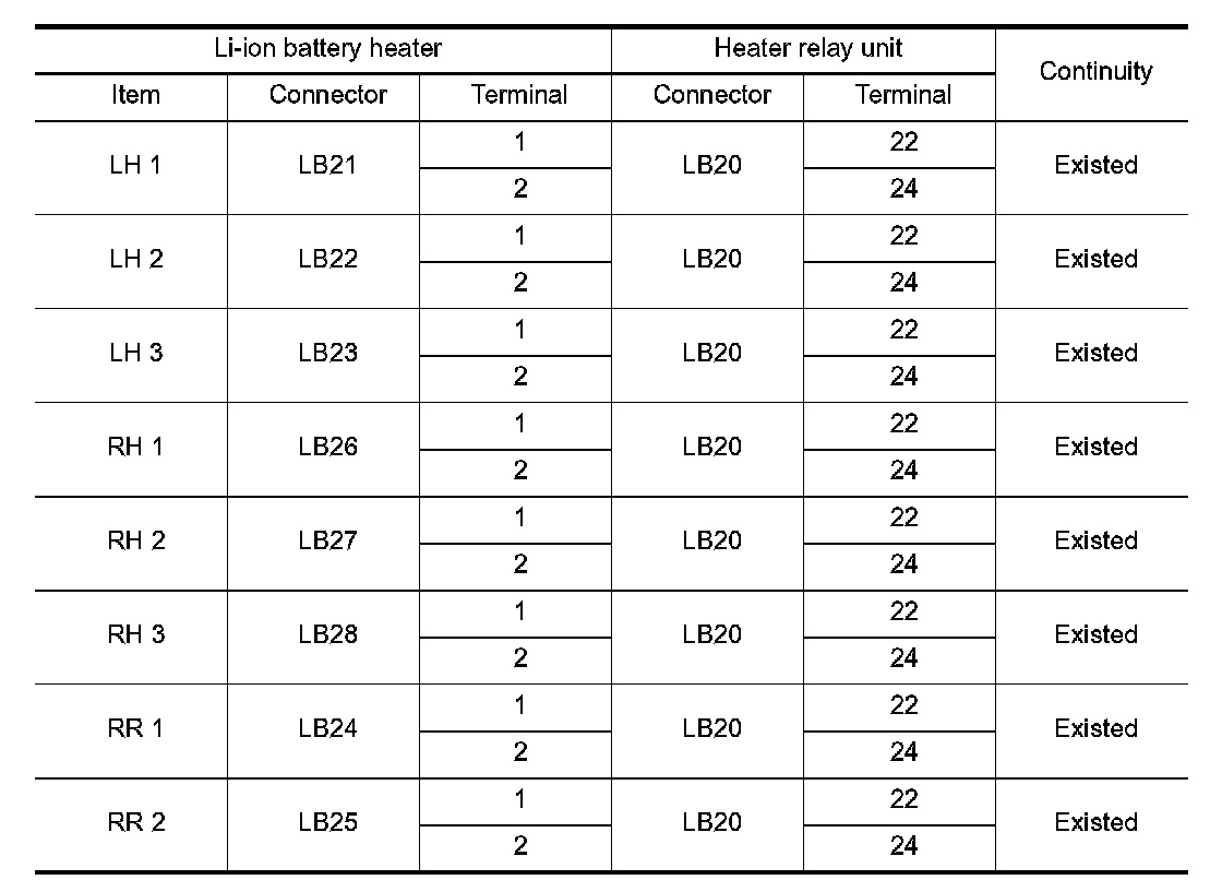 2.Check continuity Li-ion battery heater and heater relay unit harness connector harness connector.