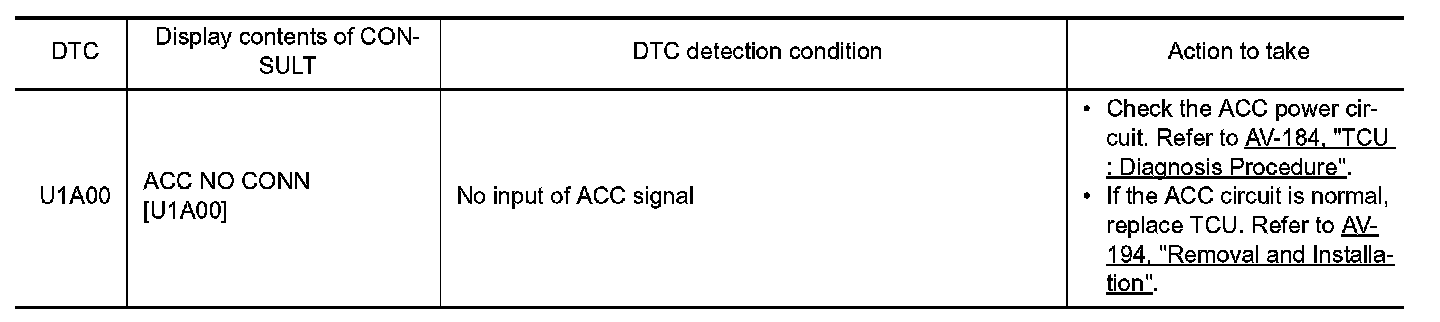 1.Check the ACC power circuit. Refer to "TCU : Diagnosis Procedure" Power Supply And Ground Circuit.