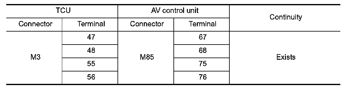 3.Check the continuity between TCU vehicle-side harness connector and TCU vehicle-side harness connector.