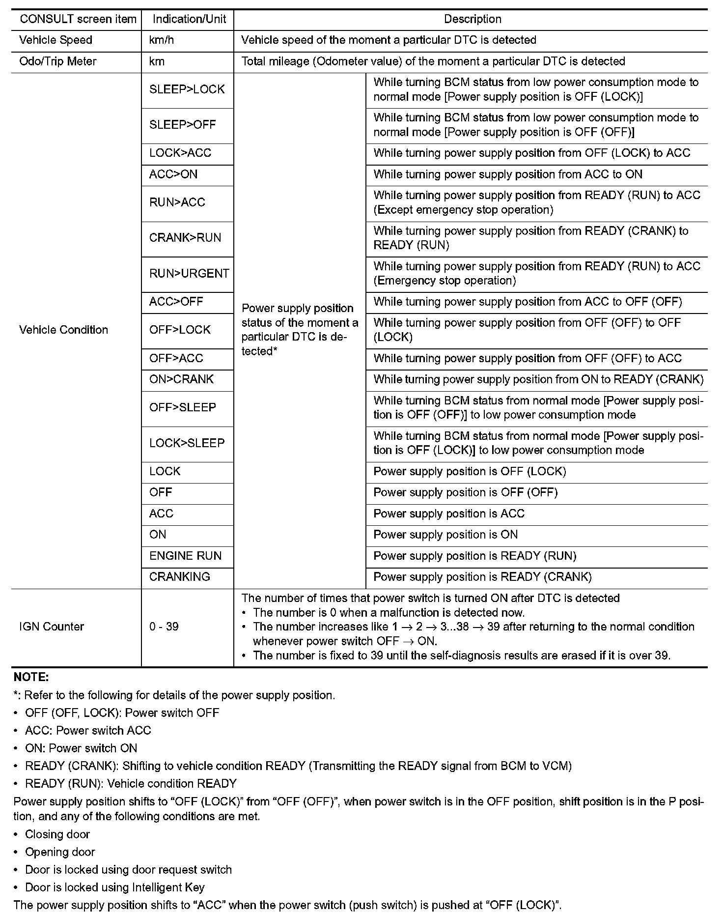 The BCM records the following vehicle condition at the time a particular DTC is detected, and displays on