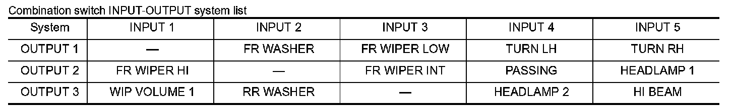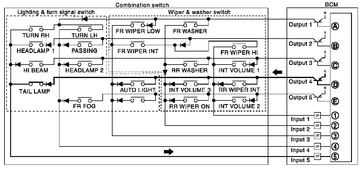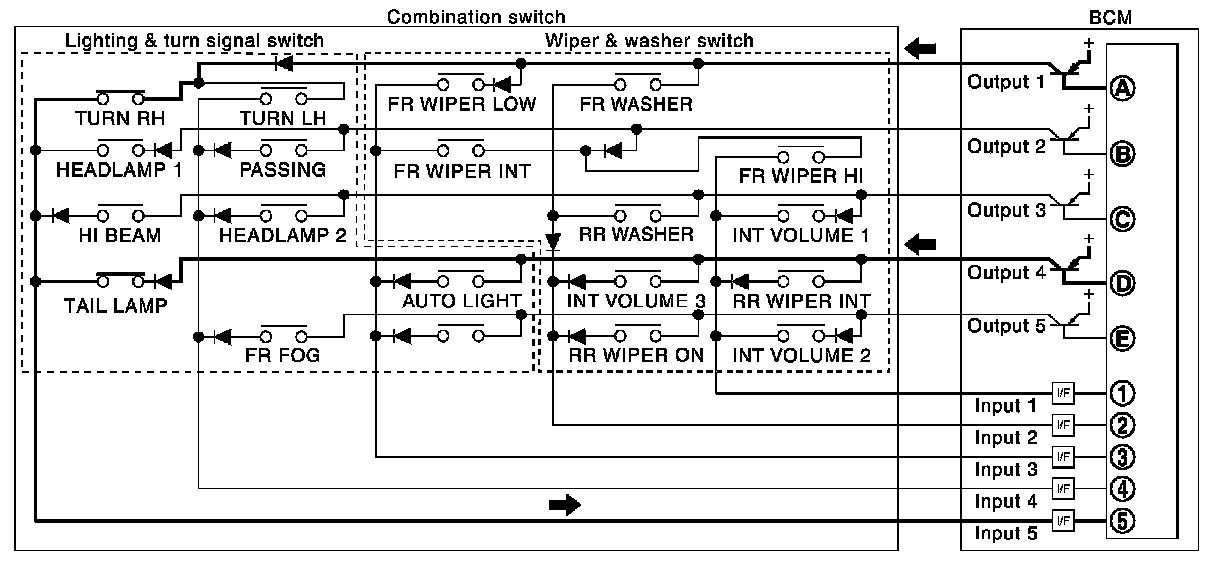 - BCM detects the combination switch status signal "5AD" when the signals of OUTPUT 1 and OUTPUT 4 are input to INPUT 5.