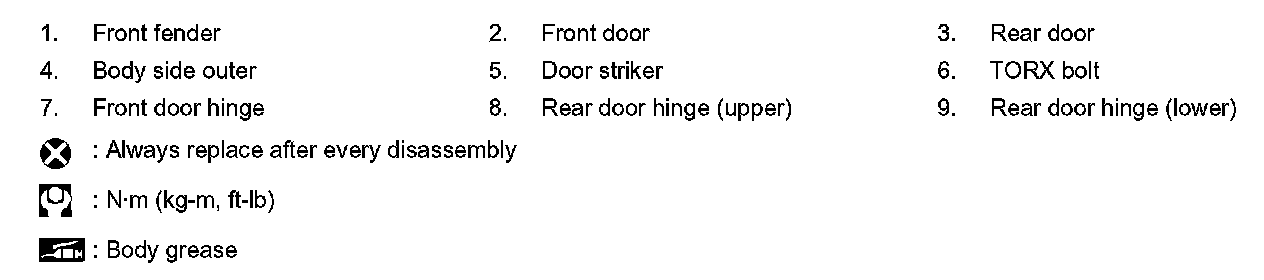 - Check door hinge rotating part for poor lubrication. If necessary, apply body grease.