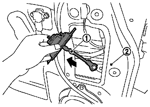 2.Remove front door finisher. Refer to "Removal and Installation" Removal And Installation.