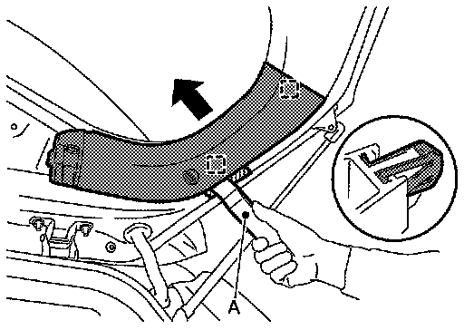 b.Disengage back door side finisher fixing metal clips with a remover tool (A), and then remove back side finisher.