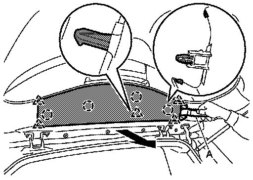 b.Disengage back door upper finisher fixing clips and pawls with a remover tool (A), and then remove back door upper finisher.