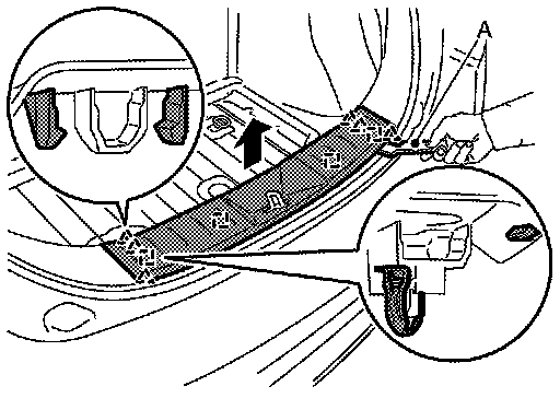 b.Disengage luggage rear plate fixing pawls and metal clips with a remover tool (A), and then remove luggage rear plate.